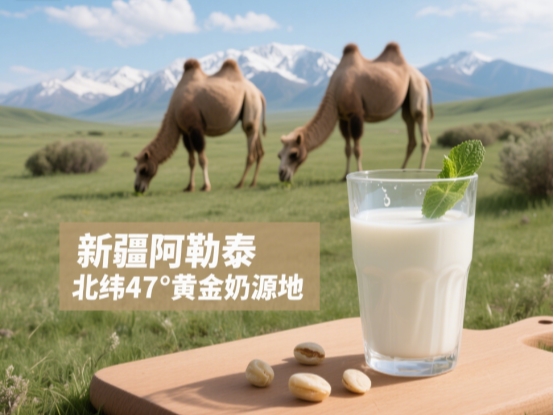 核心保障: 奶源锁定 北纬47°黄金奶源带的新疆阿勒泰草原,同样通过了双重有机认证,确保生鲜驼乳纯净无污染。