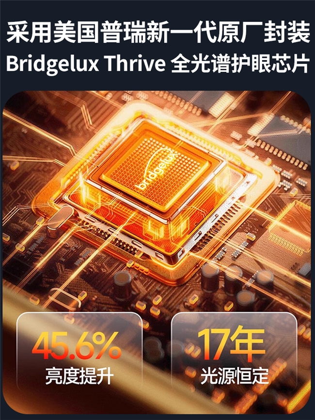 Thrive芯片技术下放:采用美国瑞新一代原厂封装BridgeluxThrive全光谱护眼芯片,大幅减少光效损失,光效率高达100.3LM/W。