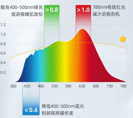 红光滋养与防蓝光:同样增加650NM有益红光波段,减少有害蓝光波动,有效守护发育中的眼睛。