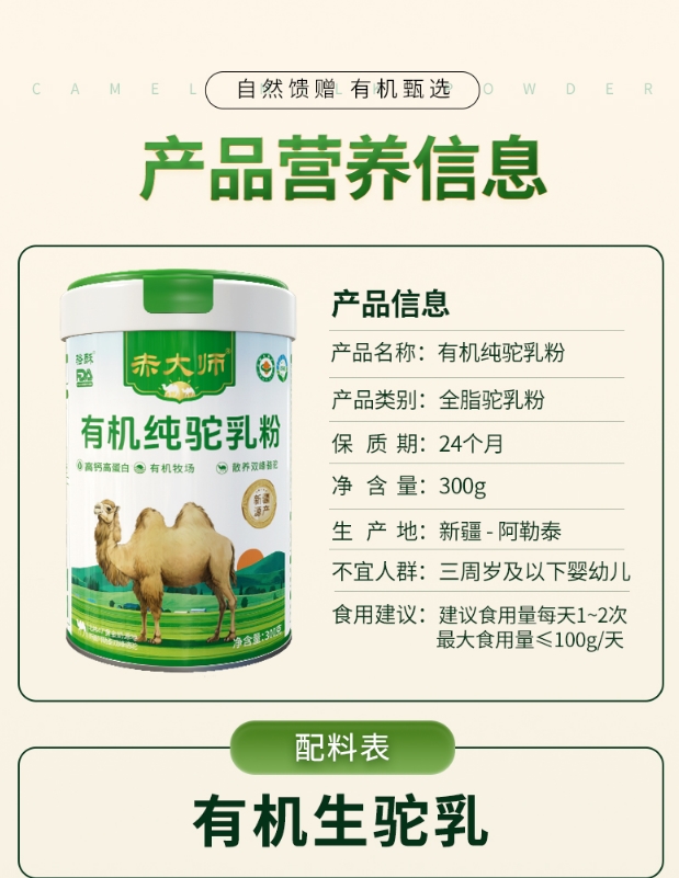 纯净至极,唯有驼乳: 配料表坦荡如砥——仅有“有机生鲜驼乳”一项,无糖、无添加剂、无植脂末,回归驼奶本真。