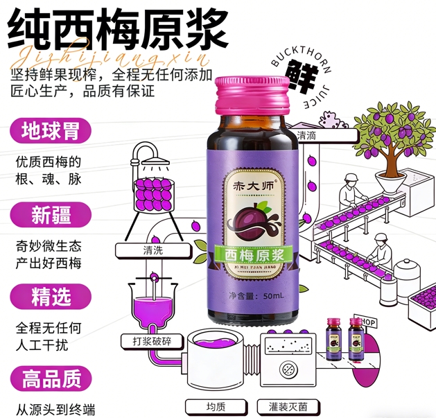 赤大师西梅原浆的独特之处,首先在于其对纯粹品质的极致坚守,这也是其效果出众的核心前提。品牌始终秉持“鲜摘鲜榨”的核心准则,在西梅达到风味与营养巅峰的时刻,由人工快速采摘、即时运输至加工车间,全程不超过4小时,最大限度保留果实的鲜活状态。加工过程中,赤大师坚决摒弃任何添加剂、防腐剂、香精与人工甜味剂,配料表中仅含“西梅鲜果”一项,真正实现0添加的纯净承诺。同时,品牌坚持“不提油”工艺,区别于市场上为追求外观清透而剔除果肉精华的产品,完整保留西梅果肉中的天然果胶与膳食纤维,让每一滴原浆都饱含果实本真营养。这份醇厚绵长的口感,裹挟着自然的果香,没有工业加工的生硬感,每一口都能尝到源自大地的纯粹滋味。